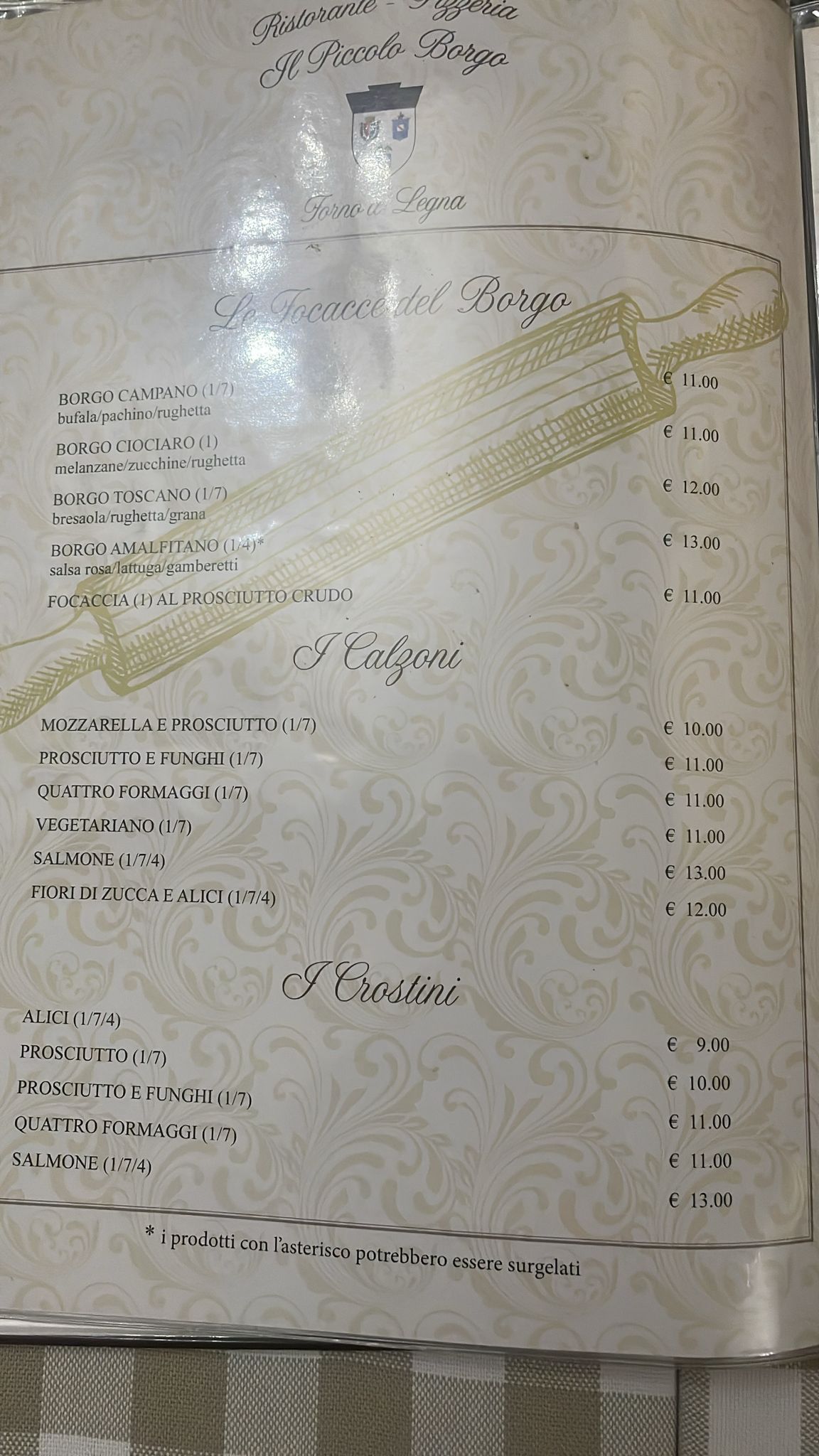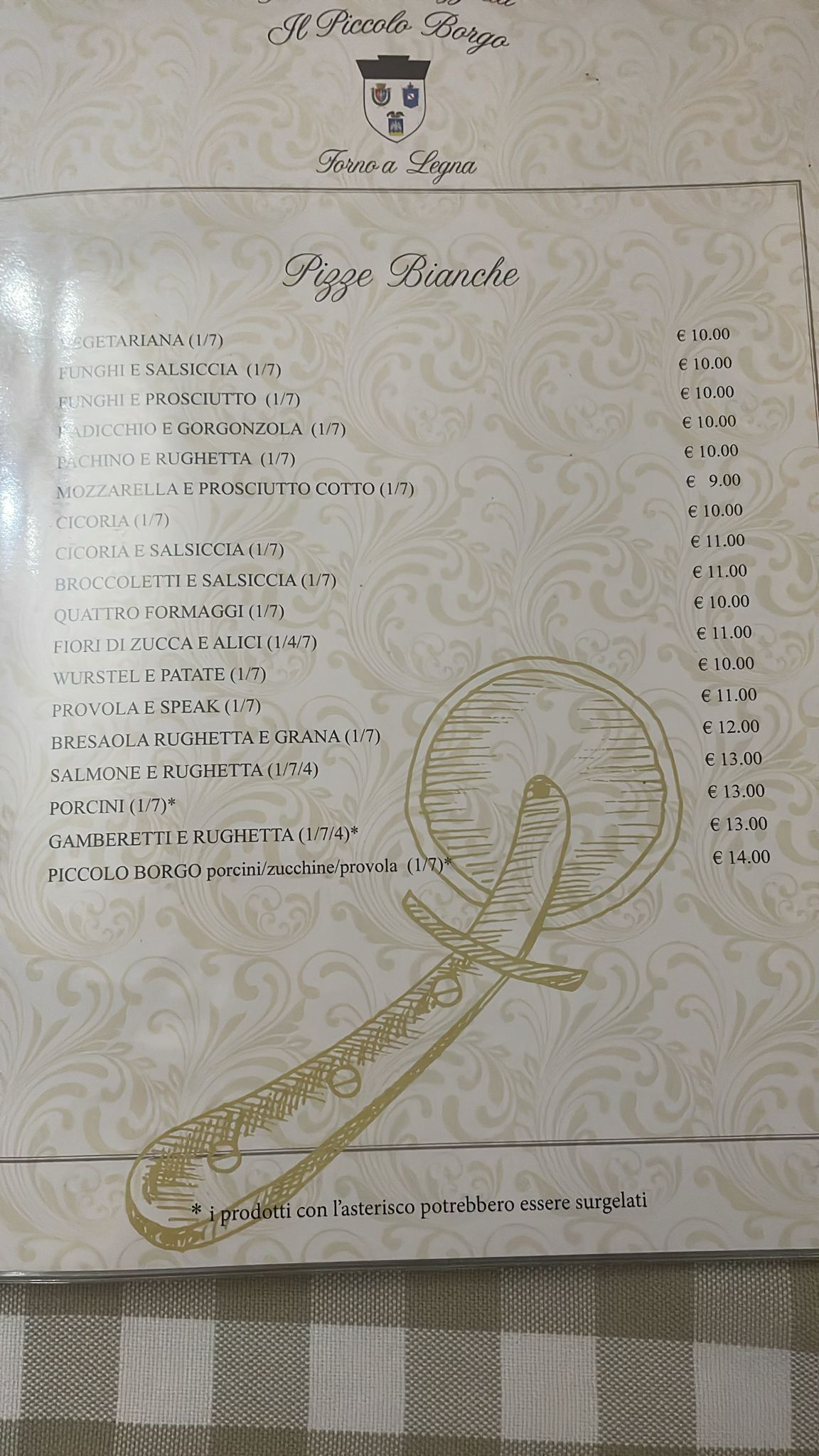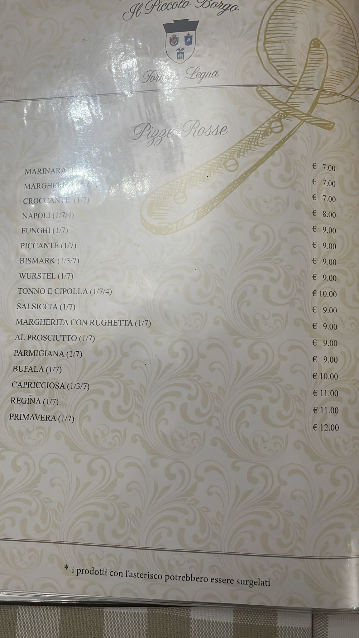 La nostra pizza è preparata con i migliori ingredienti freschi, cotta nel forno a legna, assume quella croccantezza e gusto particolare che la rendono particolarmente gustosa e gradevole. Fra le nostre specialità consigliamo quella della casa, la pizza Piccolo Borgo, composta da mozzarella, funghi porcini, zucchine e provola. Infine non mancano i fantasiosi crostini e i soffici calzoni