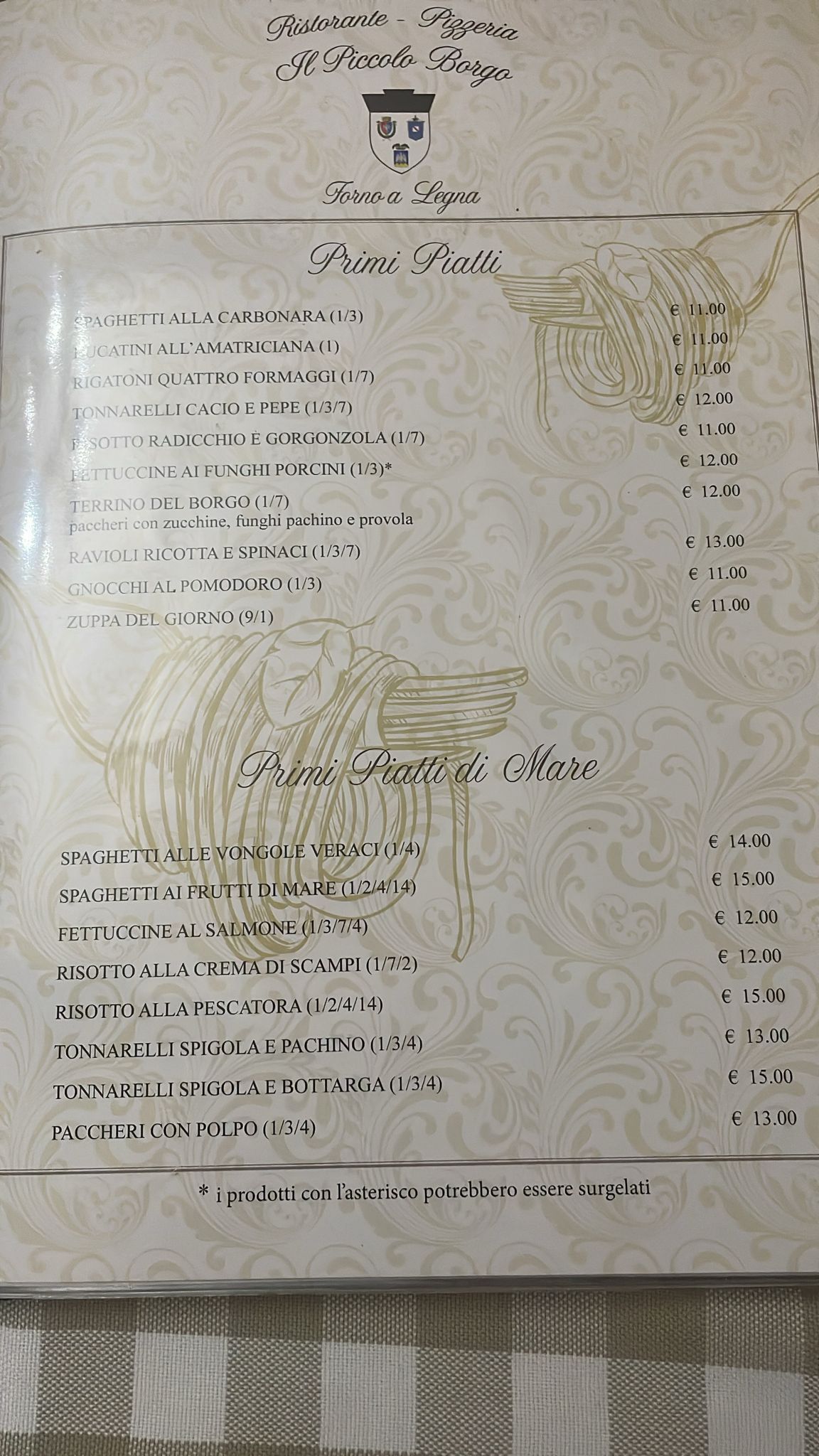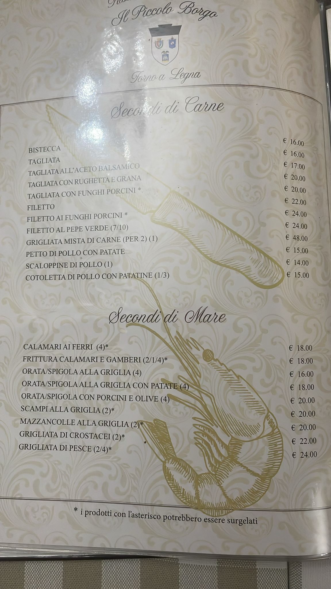 Presso il Piccolo Borgo potrete trovare un'ampia scelta di antipasti che spaziano dai classici pizzoccheri fino ad arrivare a una selezione di crudità di mare, sempre freschissime.
